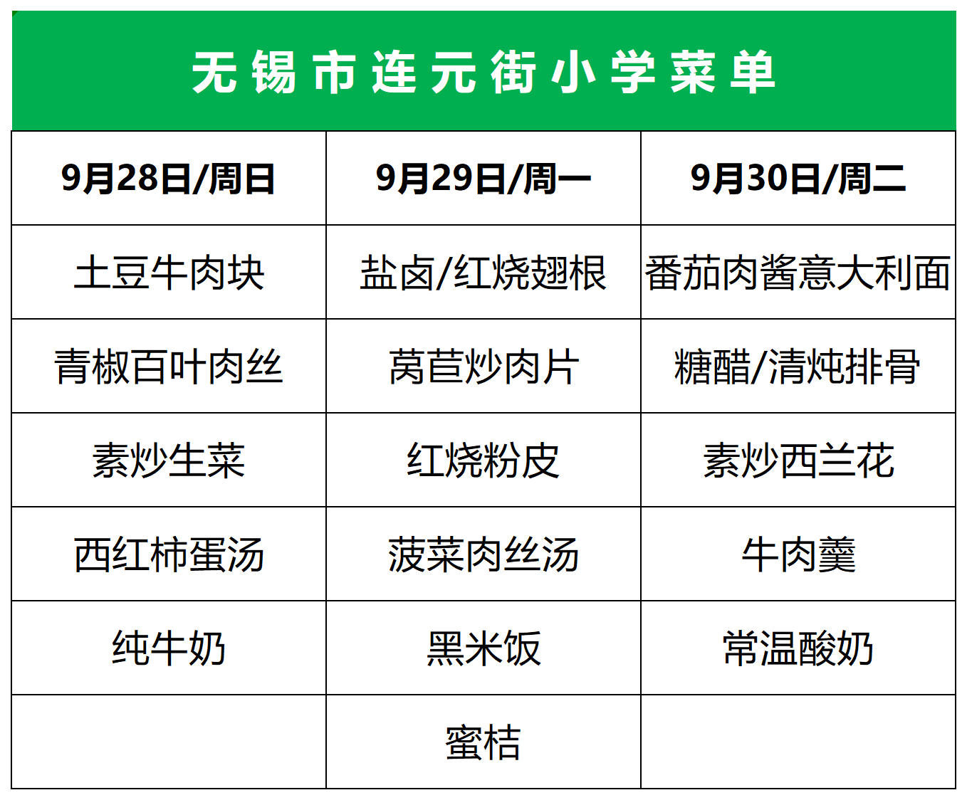2025年9月28~30日学生菜单